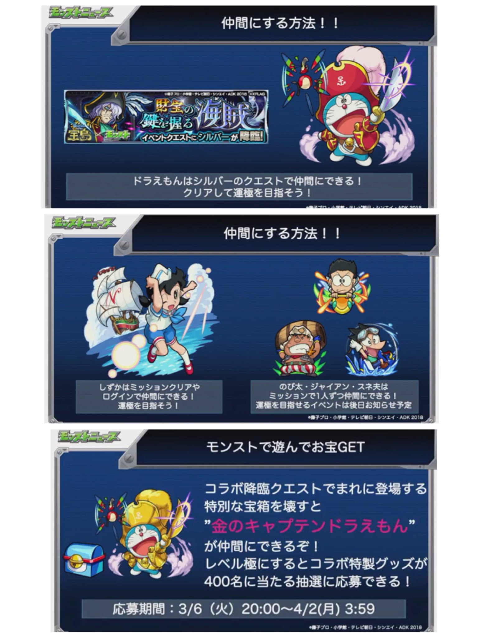 18 03 01 追記 3 15 映画ドラえもん モンスト 映画ドラえもん のび太 の宝島 とのコラボイベント 前半 を3 6 火 より期間限定で開催 モンスト にドラえもんとのび太 をはじめ しずか ジャイアン スネ夫が登場 モンスターストライク モンスト 公式サイト